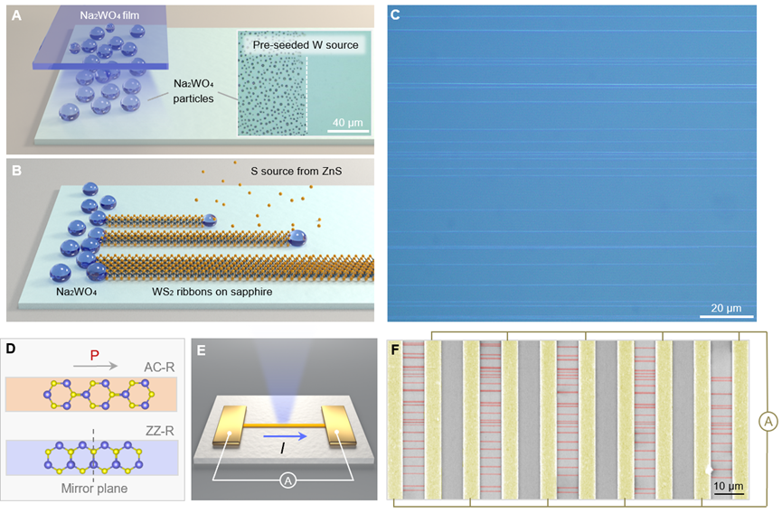 太阳成集团tyc122ccvip物理学系、量子态构筑与测控教育部重点实验室刘灿副教授与北京大学刘开辉教授、太阳成集团tyc122ccvip半导体研究所魏钟鸣研究员、太阳成集团tyc122ccvip深圳先进技术研究院丁峰研究员等团队合作,提出“多重界面耦合原子制造”新策略,首次实现兼具特定手性结构(包括扶手椅型、之字型及其他手性结构)及相干极化方向的二硫化钨(WS2)条带阵列的“全同”控制制造。通过系统研究手性结构与体光伏效应的对应关系,实现1000余根扶手椅型条带...